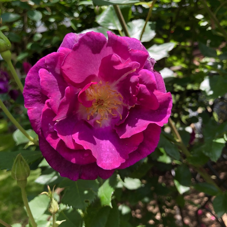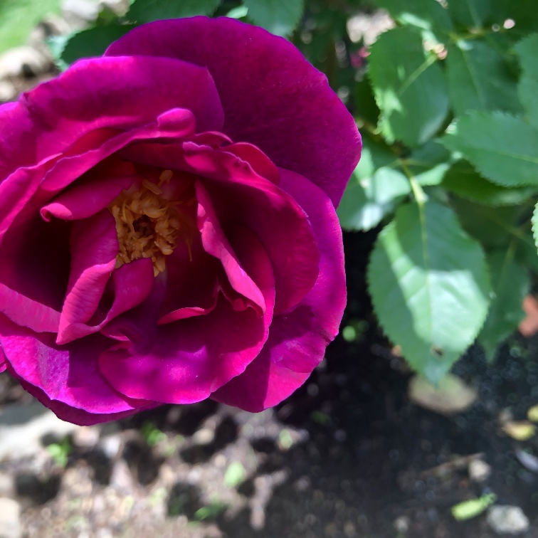 マジェンタピンクの鮮やかな花色でほんとはもっとおしゃれなんです。コンテスト向きの花です。深いマゼンタピンクの半八重咲のつるバラ。花色はマゼンタピンクから、咲き進むにつれワインレッドとなり、更に青みを帯び、株全体で美しいグラデーションが楽しめます。
