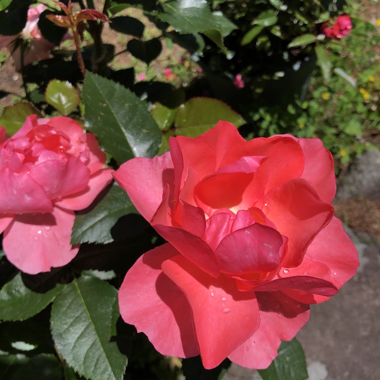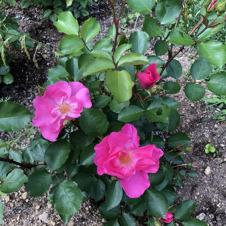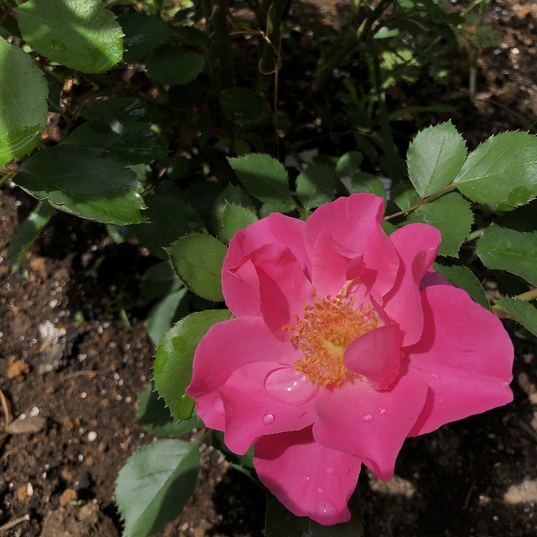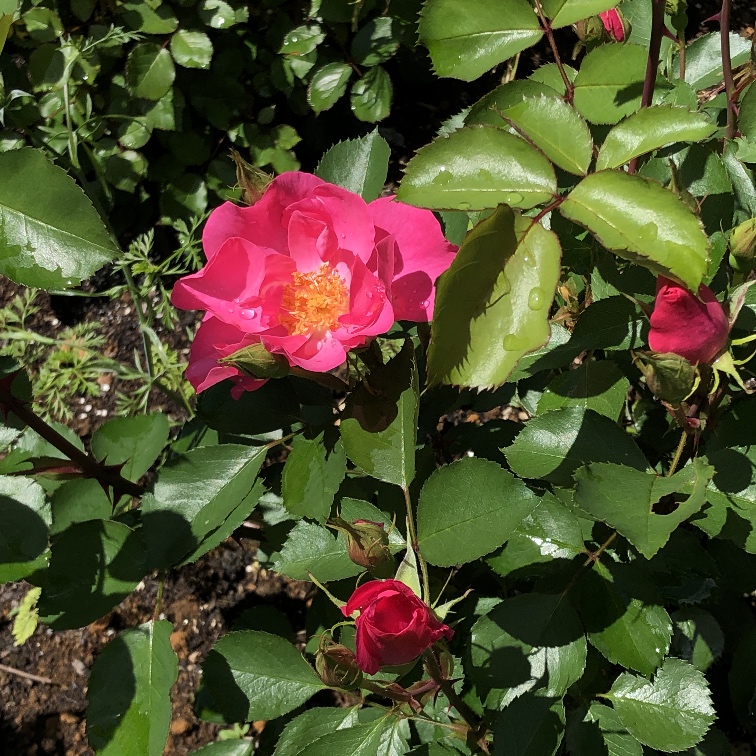 濃いピンク、丸弁咲き、中輪房咲きのバラ。ティにスパイスの微香。低温で乾いた季節には花弁が内側に丸まり匙状の花弁となる。一度見たら忘れられない個性となるが、ひと花で見るよりも株姿で見るべきバラ。シンプルな花が、いっせいに咲く姿はとても美しい。四季咲き性。春の花を切らなければ、秋には観賞価値のある中くらいのオレンジ色の実をたわわにつける。
